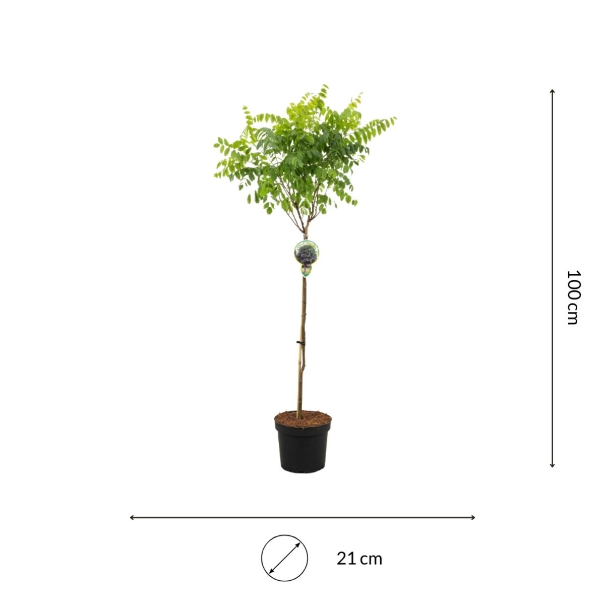 Geleverd op een stam van 80 cm en in een 21 cm pot, is deze bolacacia direct klaar om te planten als solitair accent, langs een pad of bij een terras. Volgroeid bereikt de boom circa 350 cm en is daarmee een langdurige, sfeervolle investering in uw tuin.