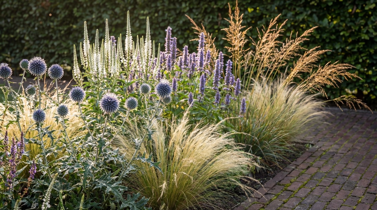 Borderpakket Isa bevat Stipa tenuifolia 'Ponytails', Veronica longifolia 'Schneeriesin', Echinops ritro 'Veitch's Blue', Agastache 'Blue Fortune' en Molinia caerulea 'Heidebraut'. Deze combinatie geeft uw border zachte kleuraccenten en een natuurlijke flow die ook buiten de bloeitijd mooi oogt.
