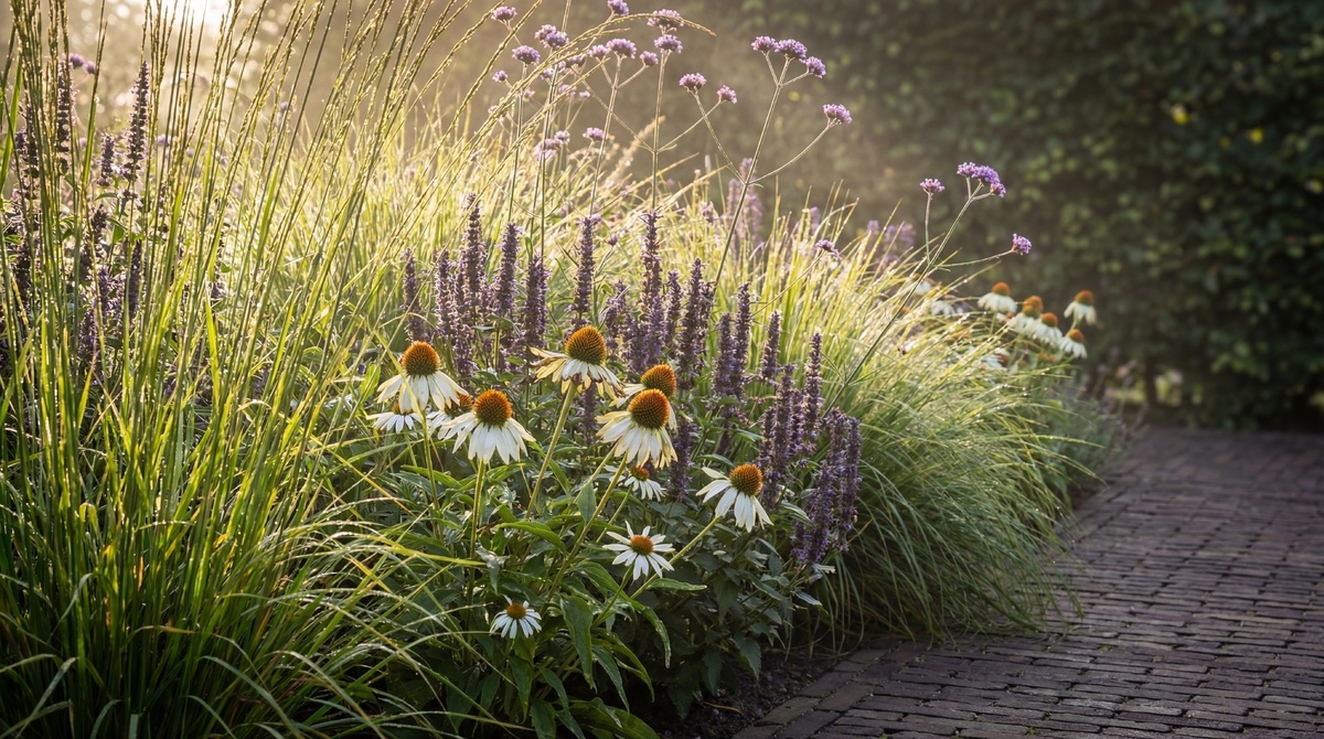 Borderpakket Joy bevat Molinia caerulea 'Heidebraut', Agastache 'Black Adder', Verbena bonariensis en Echinacea purpurea 'White Swan'. De Echinacea bloeit met fraaie witte bloemen, de Agastache is een echte bijenvriend en de siergrasjes geven beweging en hoogte. Samen bloeit dit pakket van lente tot in de herfst.