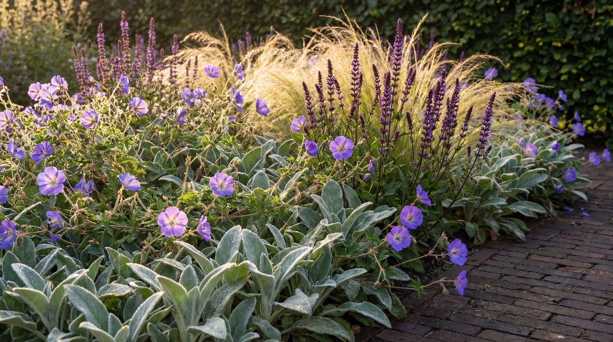 Borderpakket Lila bevat Salvia nemorosa 'Caradonna', Geranium 'Rozanne', Stachys byzantina 'Silver Carpet' en Stipa tenuifolia 'Ponytails'. Samen geven ze een zachte, paarse harmonie die de border levendig houdt van vroege zomer tot het najaar.
