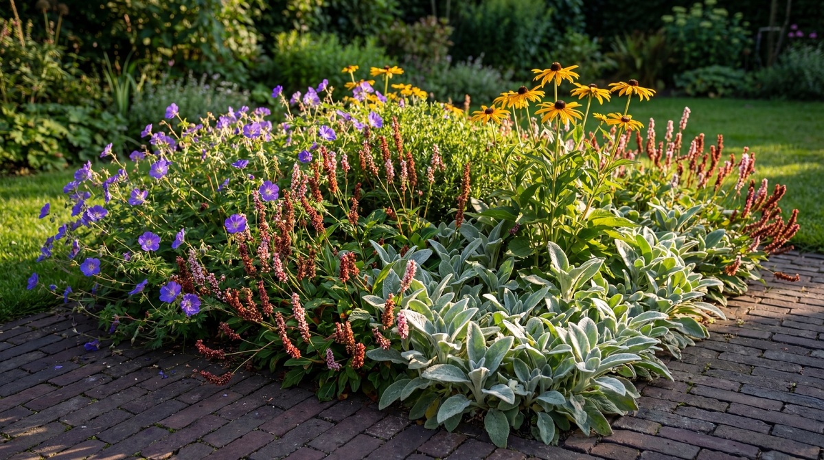 Borderpakket Rosie bevat Stachys byzantina 'Silver Carpet', Persicaria affinis 'Darjeeling Red', Geranium 'Rozanne' en Rudbeckia fulgida 'Goldsturm'. Elke plant draagt bij aan een zacht en levendig geheel dat door meerdere seizoenen mooi blijft.