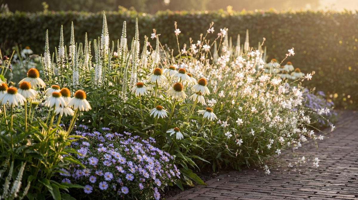 Borderpakket Yara bevat Echinacea purpurea 'White Swan', Gaura lindheimeri 'Whirling Butterflies', Stachys byzantina 'Silver Carpet' en Verbena bonariensis. De witte bloemen en zilverkleurige bladeren geven de border een heldere, verfijnde uitstraling die past bij elke tuinstijl.