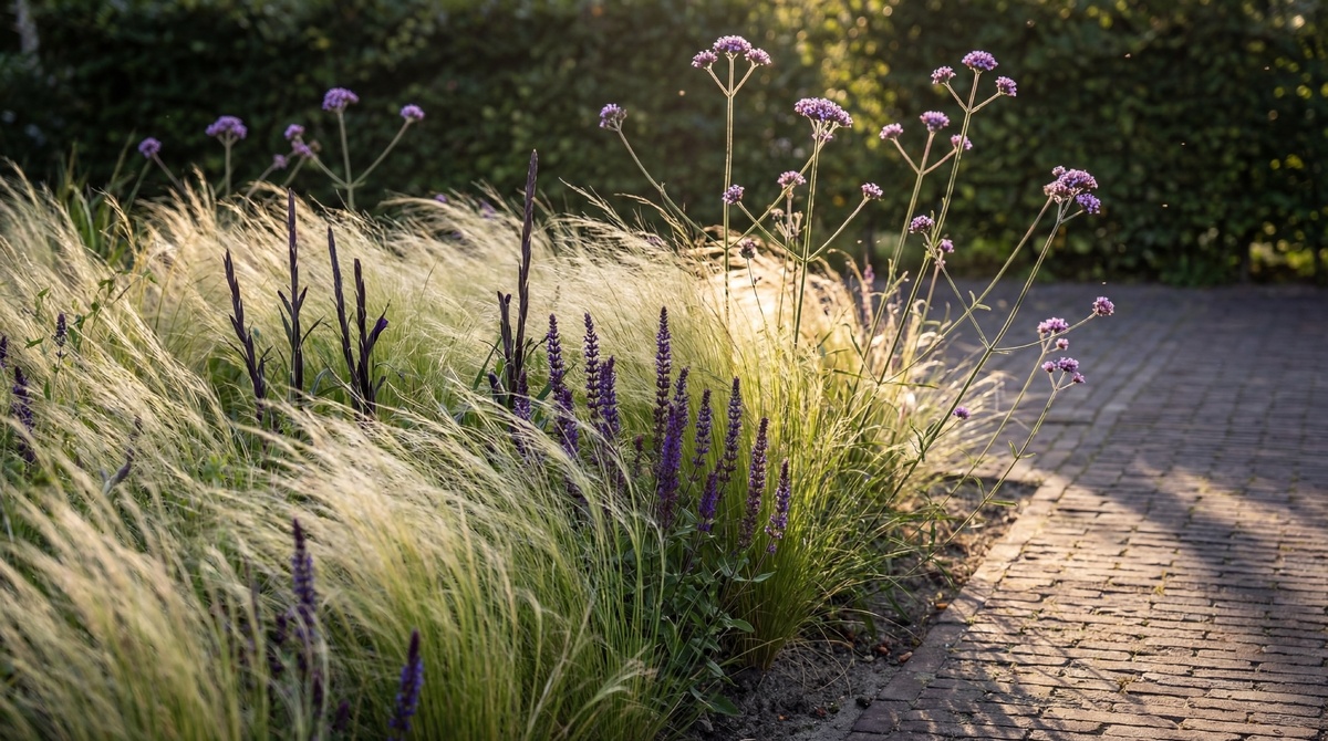 Het pakket bevat Salvia nemorosa 'Caradonna', Verbena bonariensis en Stipa tenuifolia 'Ponytails'. Deze combinatie brengt hoogte, transparantie en een tijdloze elegantie. De Verbena bonariensis trekt vlinders aan, terwijl de siergrasjes beweging en rust geven op windrige dagen.