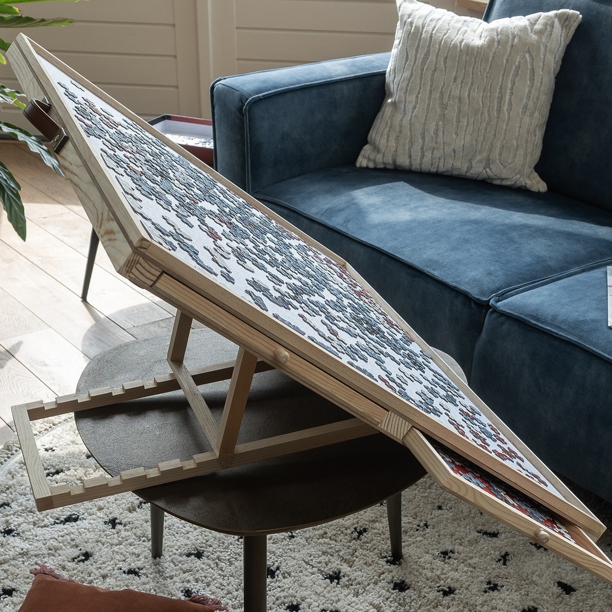Met deze verstelbare puzzelplaat met handige opberglades wordt puzzelen nóg leuker. Creëer een ideale werkplek voor uw puzzel en berg hem eenvoudig op, zelfs als hij nog niet af is. Combineert gemak en comfort voor optimaal puzzelplezier!