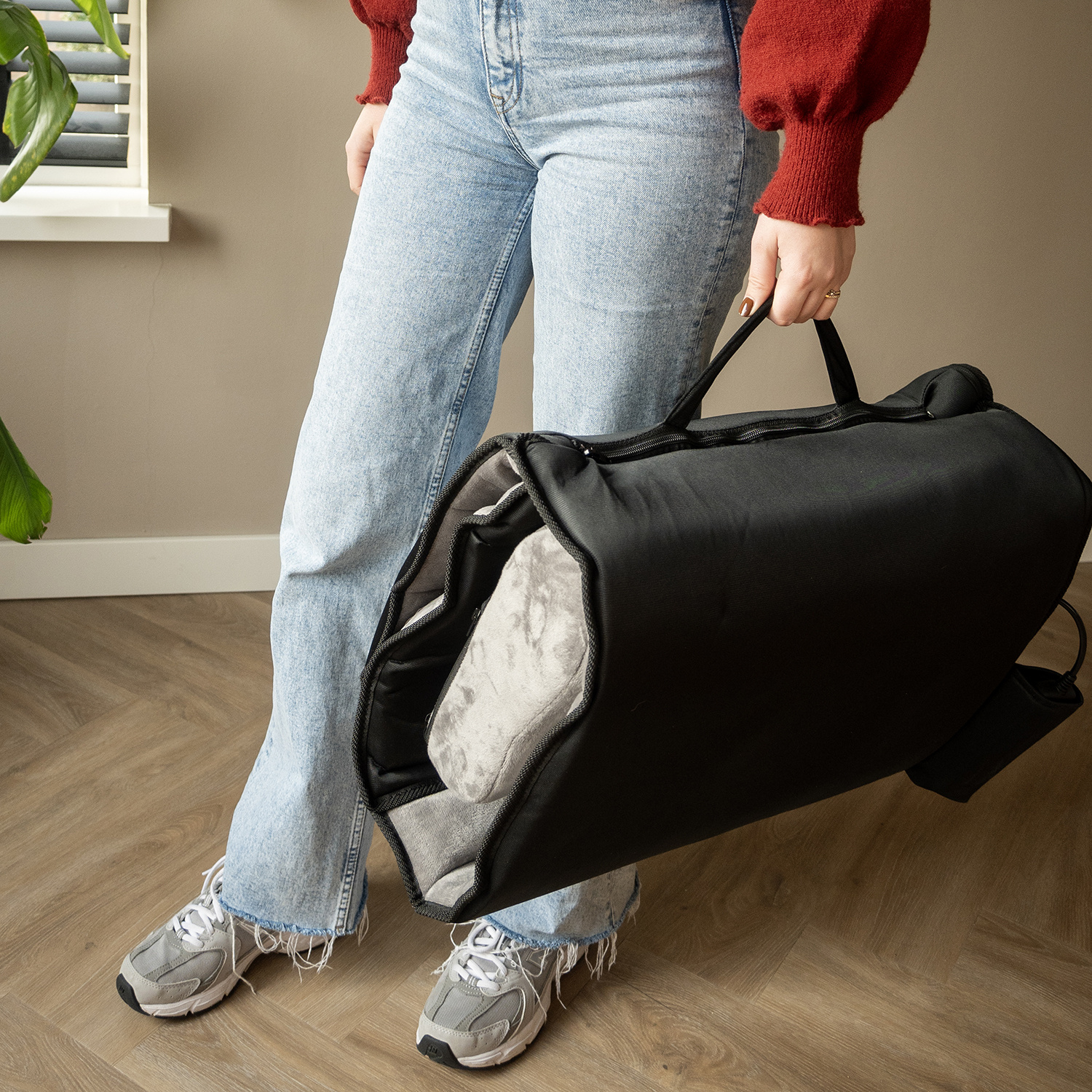 Het kussen kan los van de mat worden gebruikt, bijvoorbeeld voor uw voeten. Bovendien kan het matras worden opgerold en dichtgeritst tot een compact geheel, voorzien van een handig hengsel. Zo neemt u het massagematras gemakkelijk overal mee naartoe.