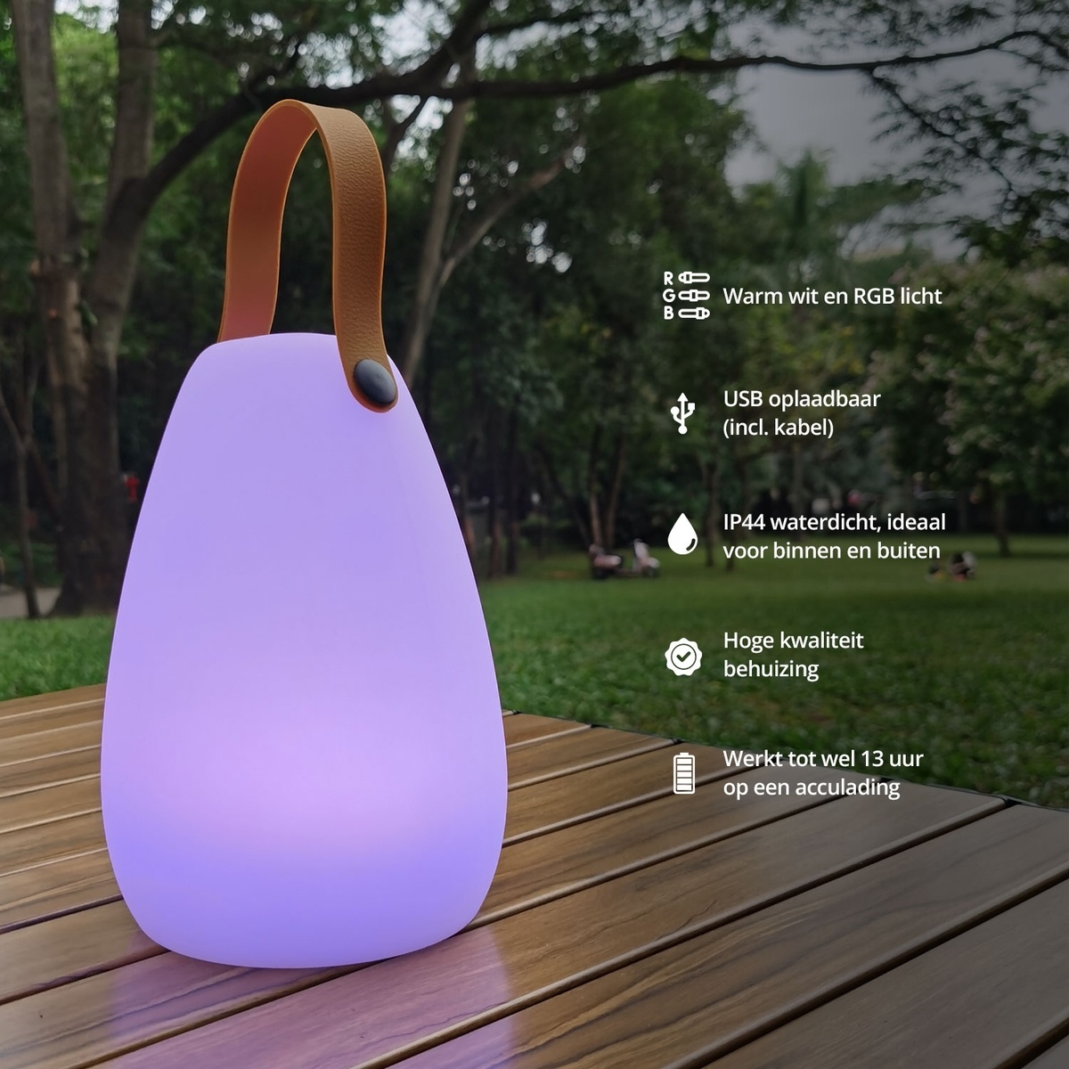 Of u nu dineert op het balkon, leest in de woonkamer of een tuinfeest geeft – de Fiji tafellamp past zich moeiteloos aan. Met een simpele druk op de knop bepaalt u de sfeer: warmwit voor rust en gezelligheid, of juist een vrolijke RGB-kleur als u iets te vieren hebt. De lamp staat stabiel, straalt klasse uit en maakt elk moment net wat gezelliger.
