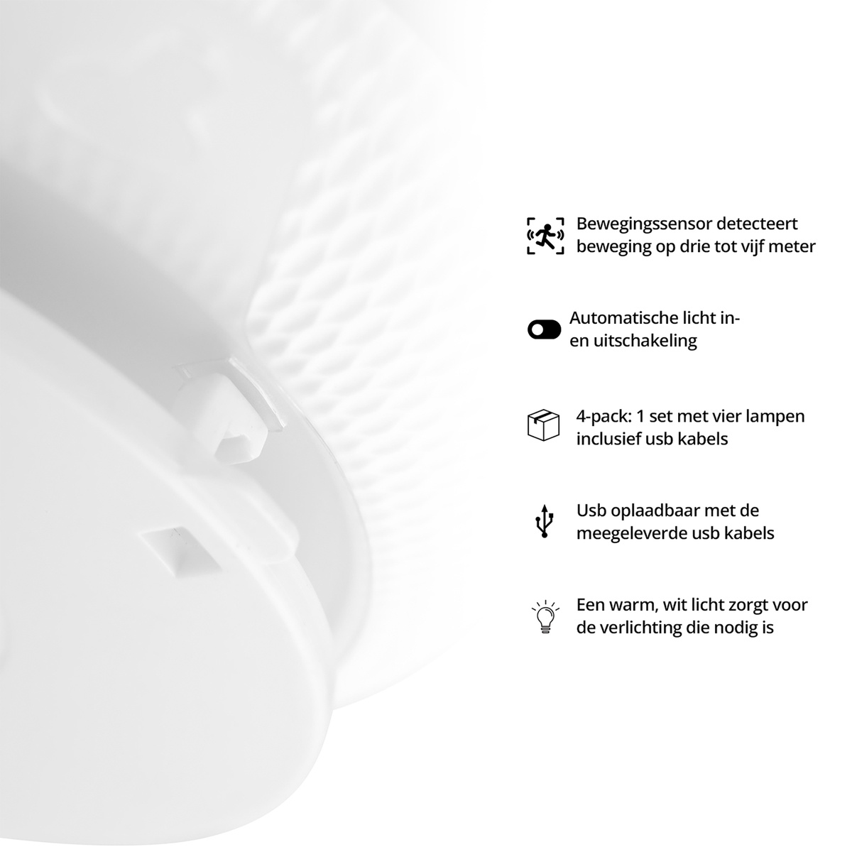 De lampen worden als set van 4 stuks geleverd en zorgen voor optimaal zicht dankzij het warm witte licht. De lampjes zijn niet alleen handig voor uw kasten maar kan ook dienen als zaklamp in de 'ALWAYS ON' stand.