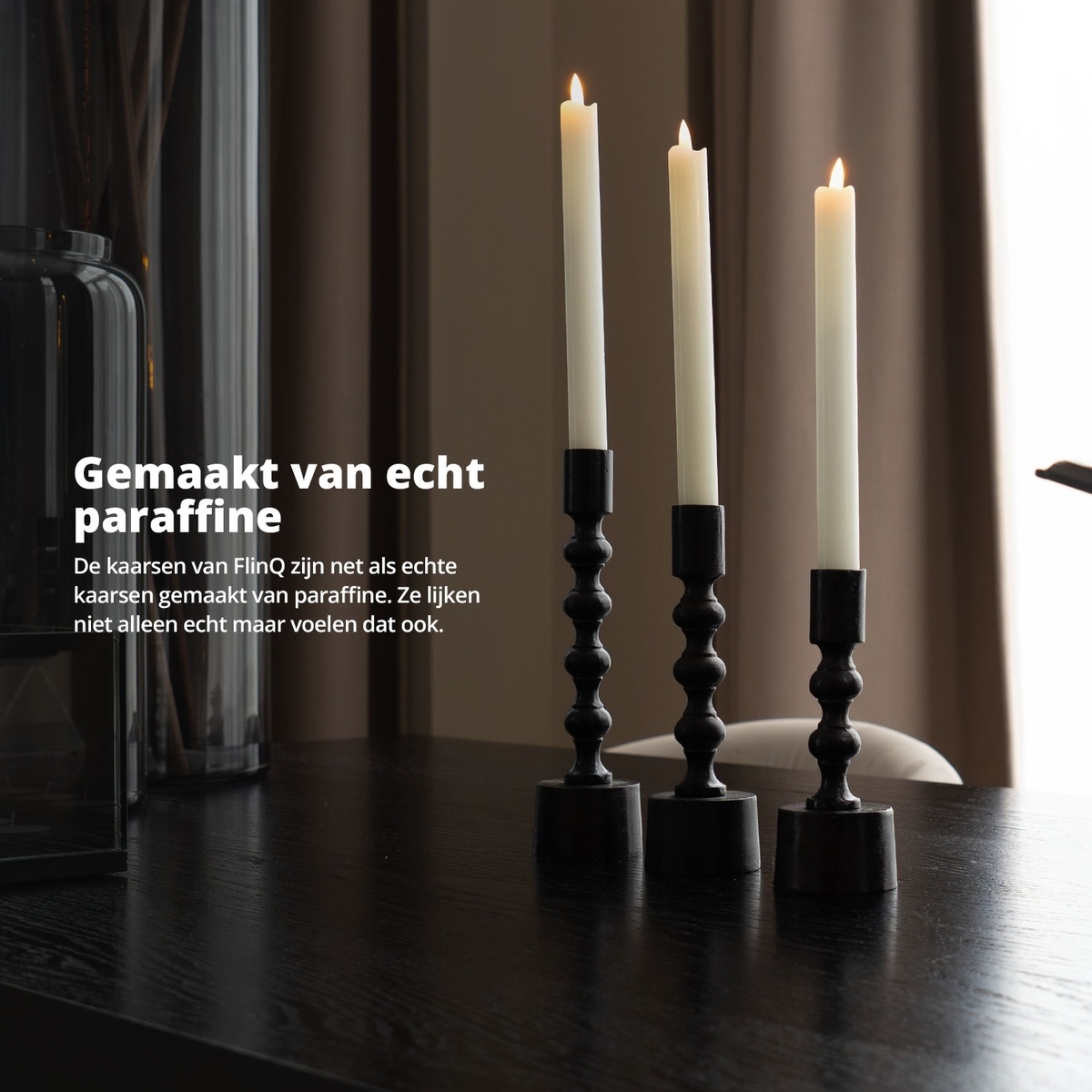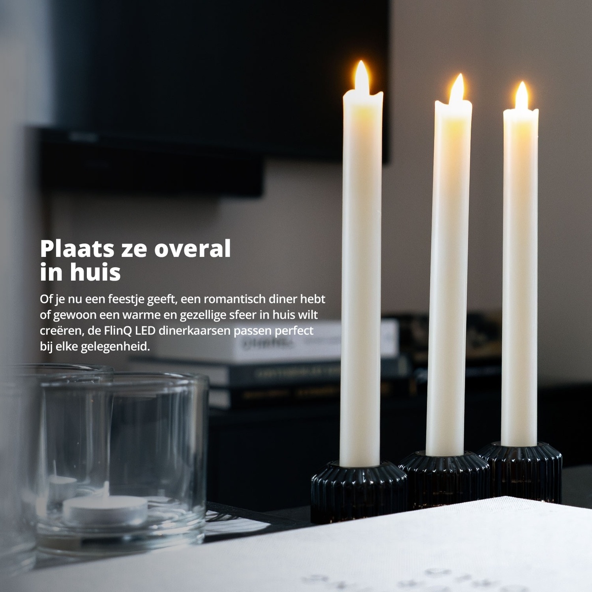 De FlinQ LED dinerkaarsen werken op twee AAA-batterijen per kaars, waardoor ze uiterst gebruiksvriendelijk en flexibel zijn. U hoeft zich geen zorgen te maken over snoeren of het vinden van een stopcontact zoals bij oplaadbare kaarsen. Plaats gewoon de batterijen en geniet van urenlang sfeervol licht. Deze kaarsen zijn niet alleen duurzaam, maar ook energiezuinig, zodat u langer kunt genieten van hun warme gloed. Bovendien zijn de batterijen eenvoudig te vervangen, waardoor u in een handomdraai weer een gezellige sfeer creëert.