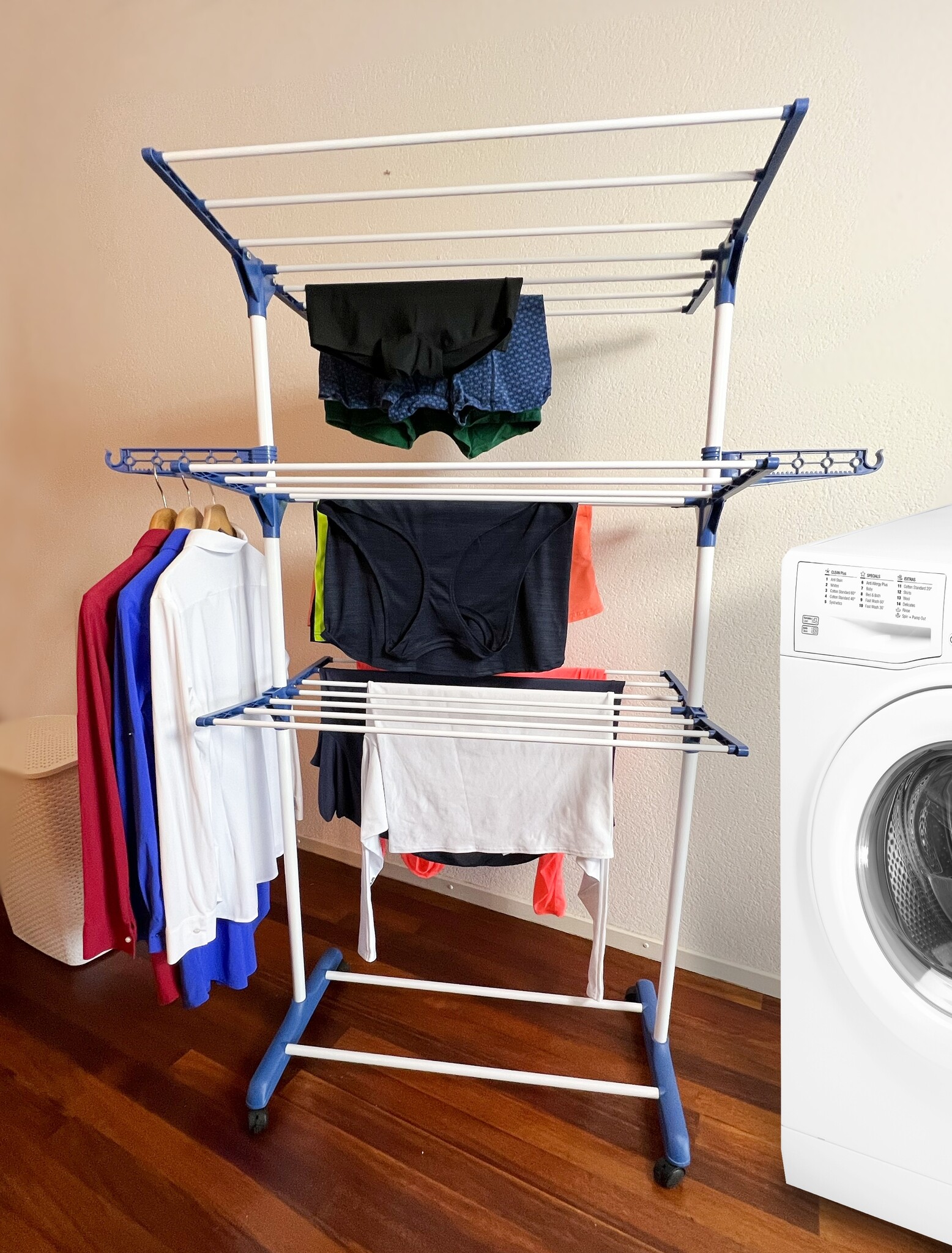 De droogtoren is licht van gewicht en eenvoudig verplaatsbaar dankzij zijn wieltjes. Verder beschikt het wasrek over spreidstaven om zo snel en geventileerd te kunnen drogen. Het versterkte ABS-materiaal zorgt voor een stevig model met 4 vergrendelbare wielen om het wasrek van stabiliteit te voorzien. Door het inklapbare ontwerp is het wasrek gemakkelijk op te bergen achter een deur of op een andere smalle plek.