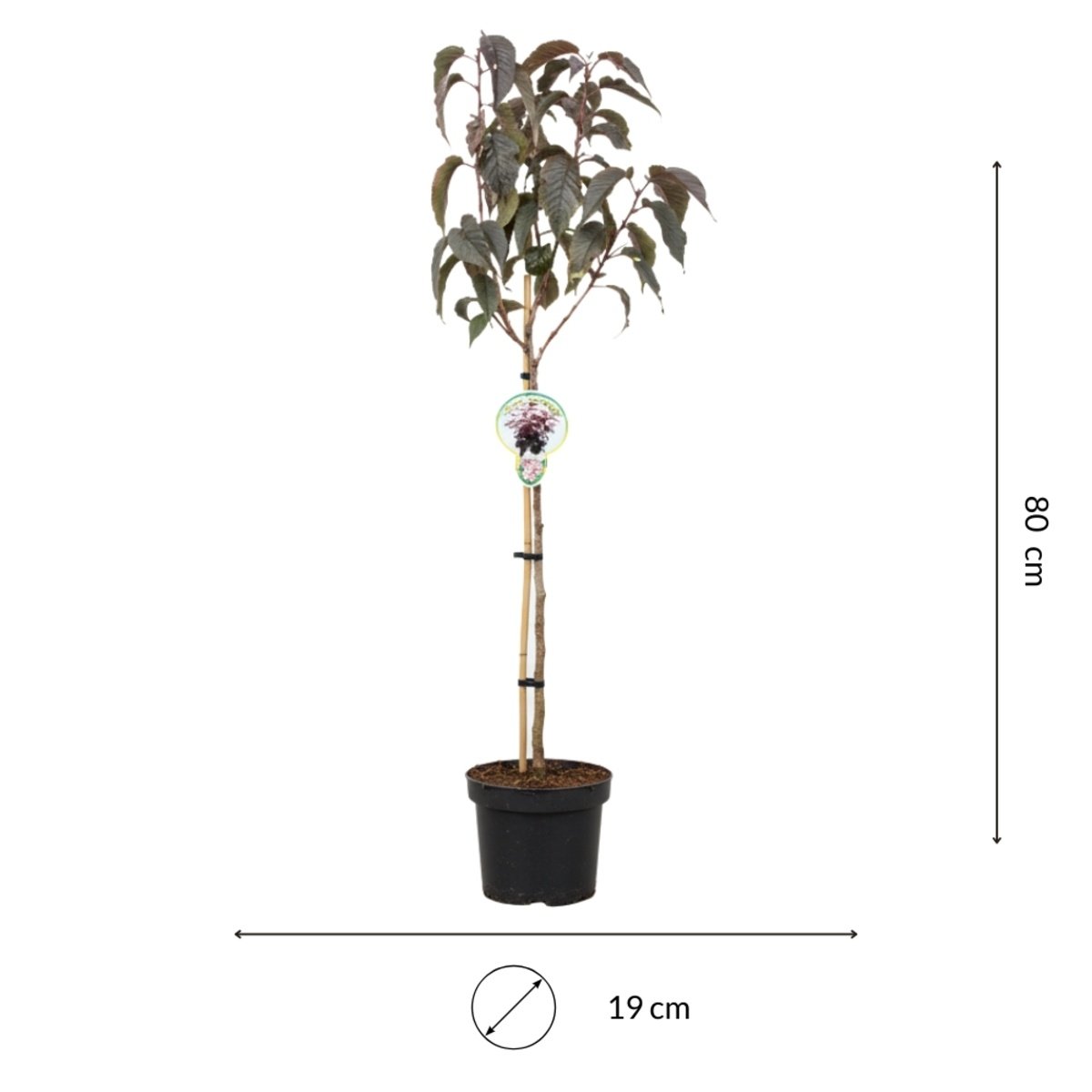 Dankzij de stamvorm neemt deze sierkers weinig ruimte in beslag en past hij zelfs in een ruime pot. De boom groeit tot circa 350 cm hoog en staat het mooist op een zonnige tot halfschaduwrijke plek. De stamhoogte bij levering is circa 80 cm, de totale hoogte circa 100 cm.