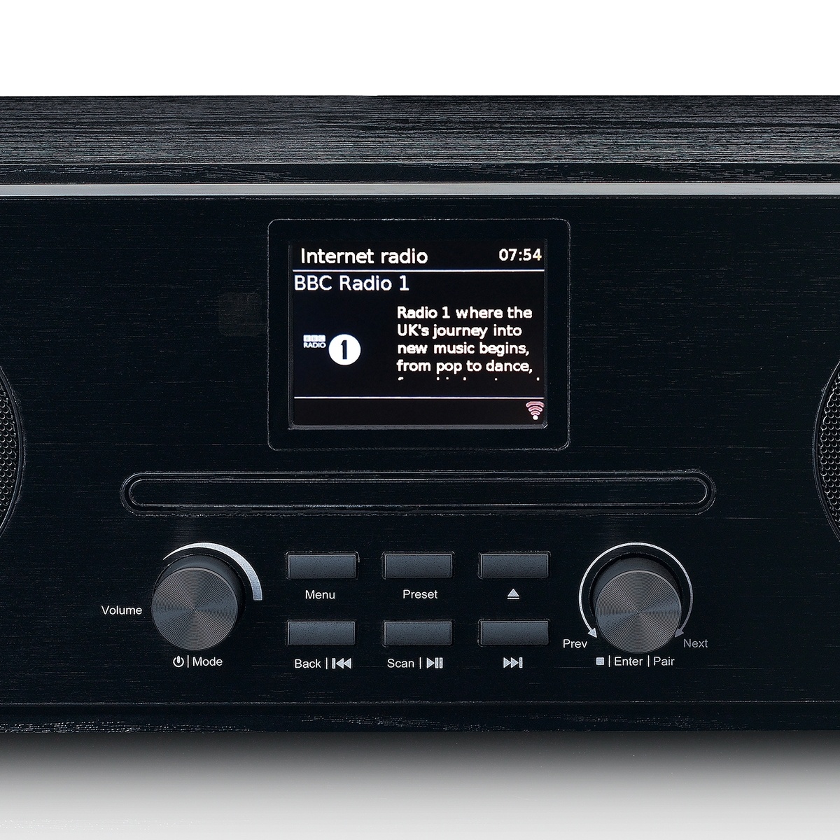 Het 7 cm LCD-kleurenscherm zorgt voor een duidelijke weergave van zenders en instellingen. De houten behuizing draagt bij aan een warme, volle geluidskwaliteit.