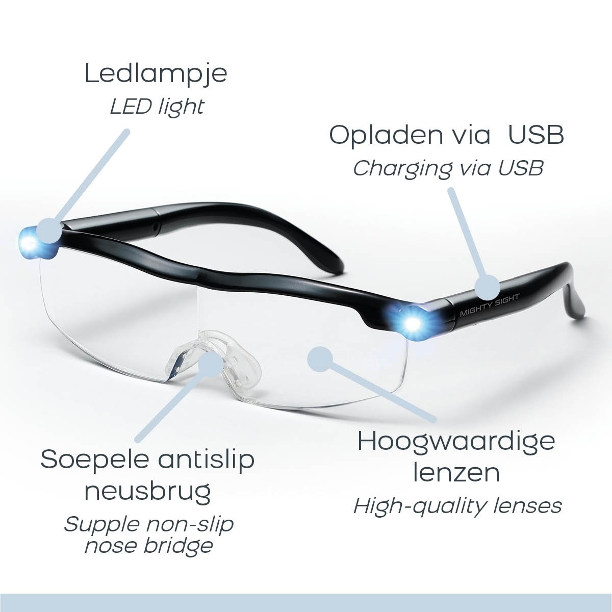 De Mighty Sight Glasses zijn licht in gewicht, eenvoudig oplaadbaar en passen vrijwel iedereen. Met de meegeleverde USB-kabel laadt u de bril in slechts 30 minuten volledig op, waarna u hem tot 3 uur lang draadloos kunt gebruiken.