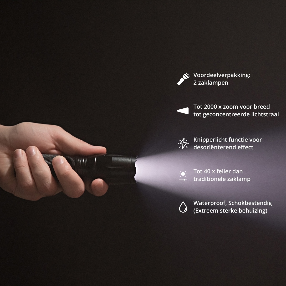 Naast het feit dat u met deze zaklamp makkelijk de weg in het donker kunt vinden, zou u met deze zaklamp bijvoorbeeld ook eenvoudig indringers kunnen desoriënteren. Bent u wel eens in het donker gefotografeerd door een camera met flitser? Dan weet u dat het 4 minuten kan duren om weer een beetje normaal te kunnen zien. Deze zaklamp is tot wel 100 keer feller, mits u deze op de zoom-stand zet. Met de zaklamp bent u dus ook altijd maximaal voorbereid op mogelijk gevaar!