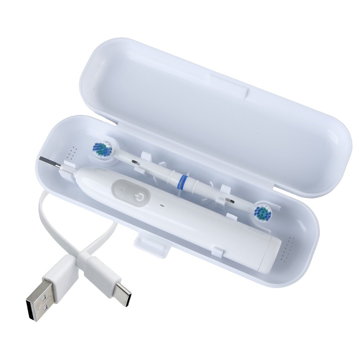 Dankzij de meegeleverde compacte reisetui neemt u uw tandenborstel altijd schoon en beschermd mee. De case biedt ruimte aan zowel het handvat als de opzetborstels en past perfect in uw handbagage of toilettas.