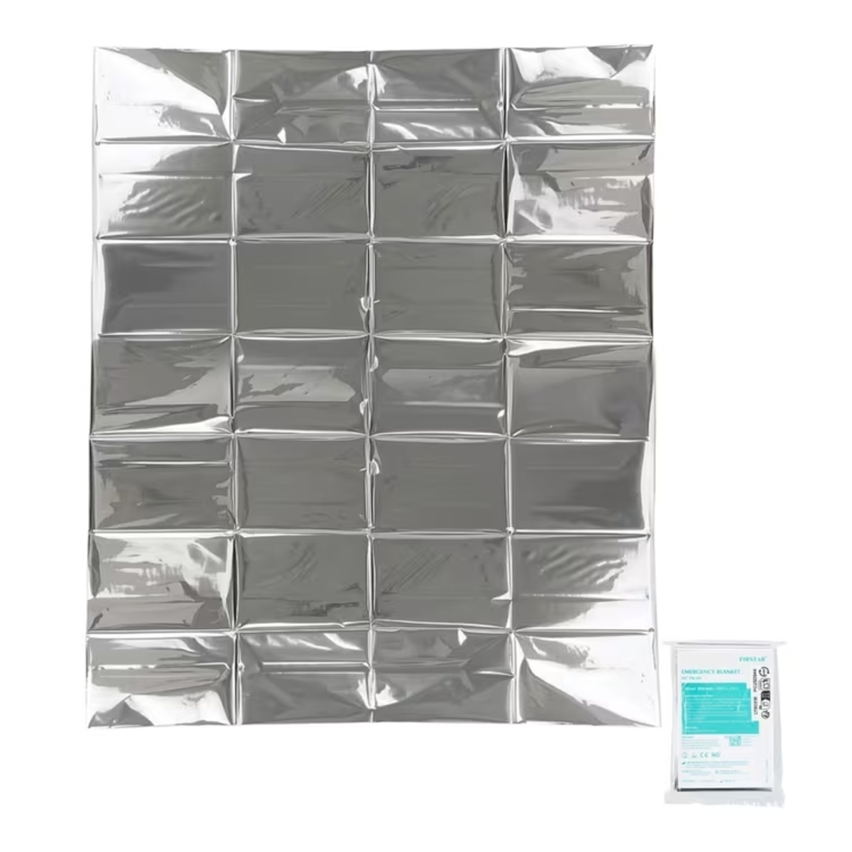 • Nooddeken: 210 × 130 cm, warmtereflecterend, lichtgewicht PET-film