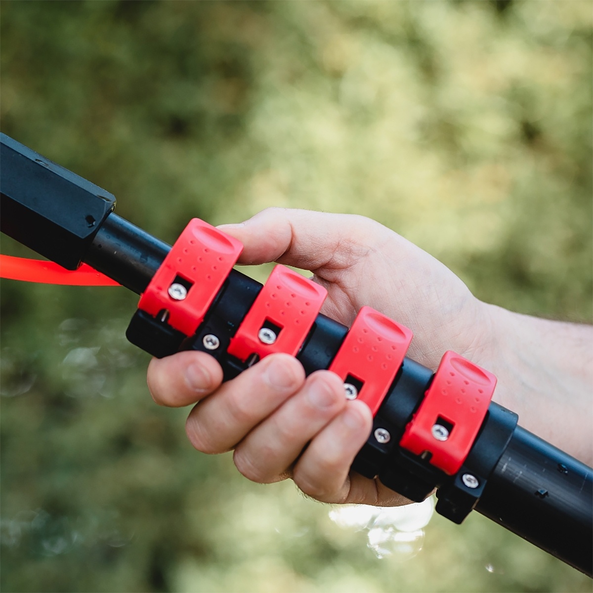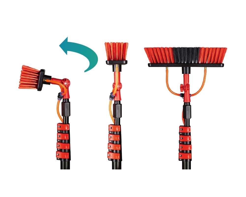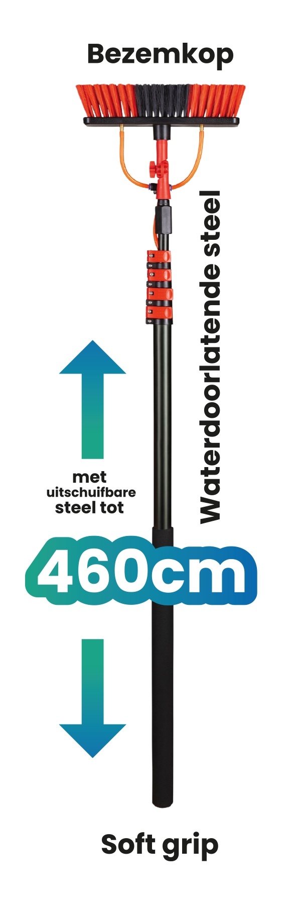 De uitschuifbare waterborstel beschikt over een steel met softgrip voor veel stevigheid en bediengemak, ook wanneer de maximale lengte op 4,6 meter staat ingesteld.