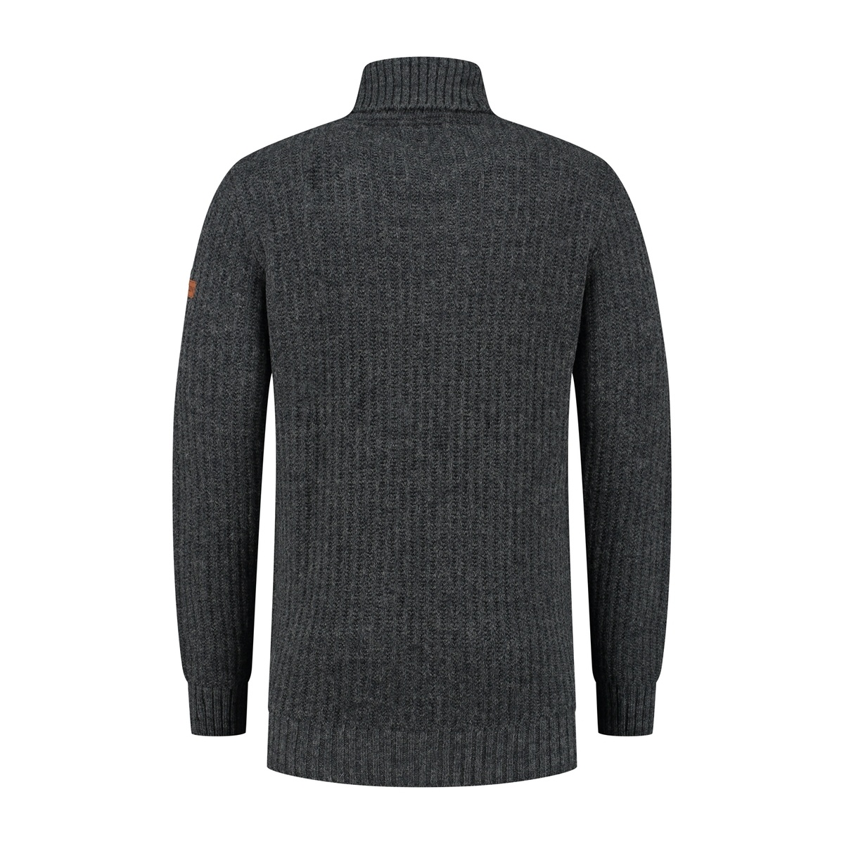 • Afwerking: Ribgebreide manchetten en boord, omslagcol