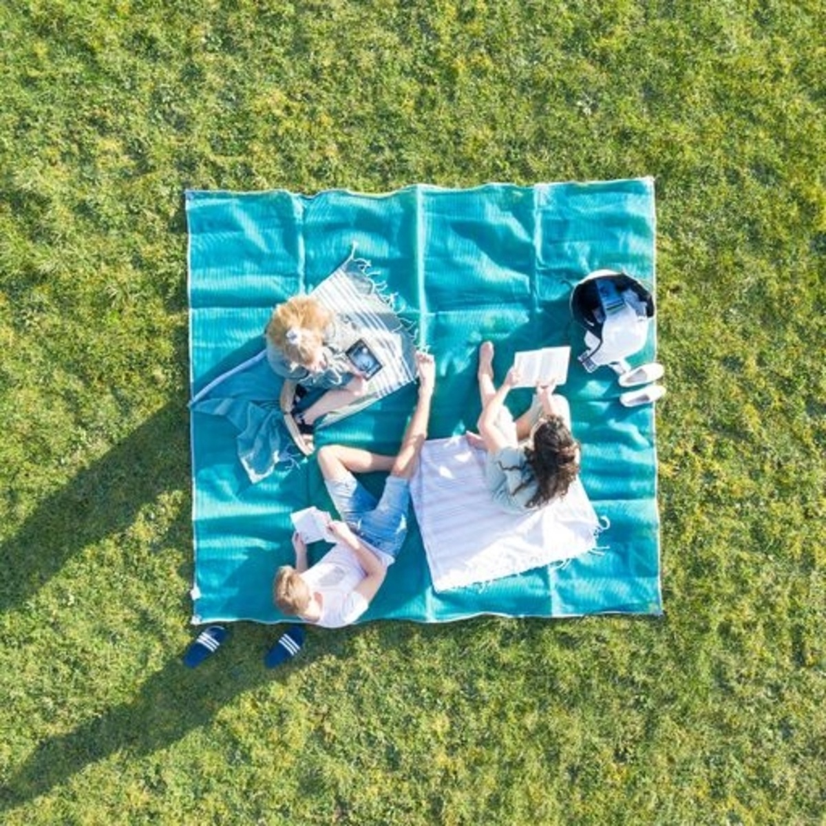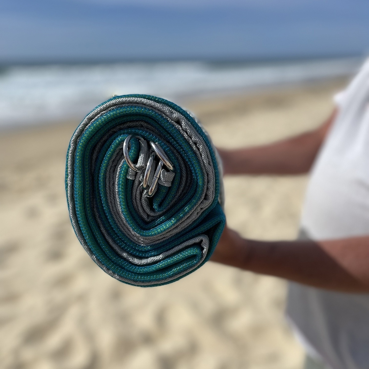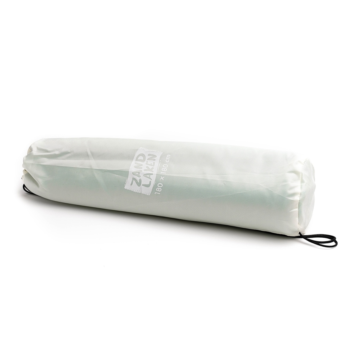 Deze onmisbare, comfortabele zandlaken is dubbelzijdig uitgevoerd in twee kleuren, groen en blauw, en is volledig omkeerbaar. U kunt uw handdoeken in het midden neerleggen voor extra comfort en het laken eenvoudig vastzetten via de ringen in de hoeken. Op de camping kunt u het laken voor de tent of caravan plaatsen. Het Zandlaken is daarentegen 180x180cm groot, licht van gewicht en wordt geleverd in een handige draagtas. Outdoor comfort gegarandeerd deze zomer!